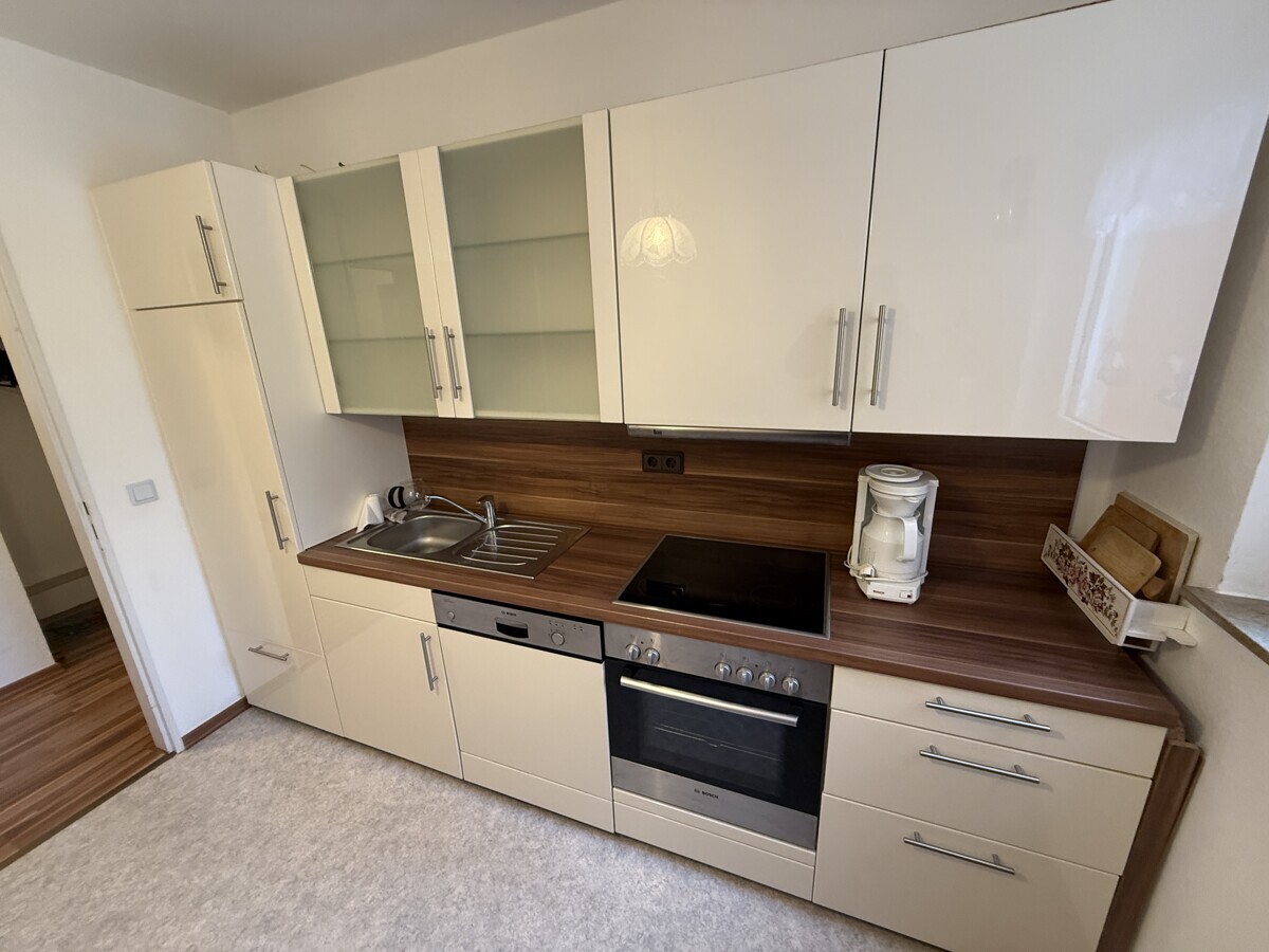 Recht modern ist die farblich neutral gehaltene, helle Einbauküche mit Bosch-Elektrogeräten.