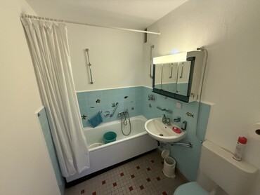 Das Badezimmer ist innenliegend und müsste saniert werden.