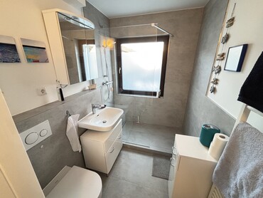 Das im Jahre 2023 hochwertig modernisierte Badezimmer mit offener, großer Dusche, Waschmaschinenanschluss und Fenster lässt keine Wünsche offen.